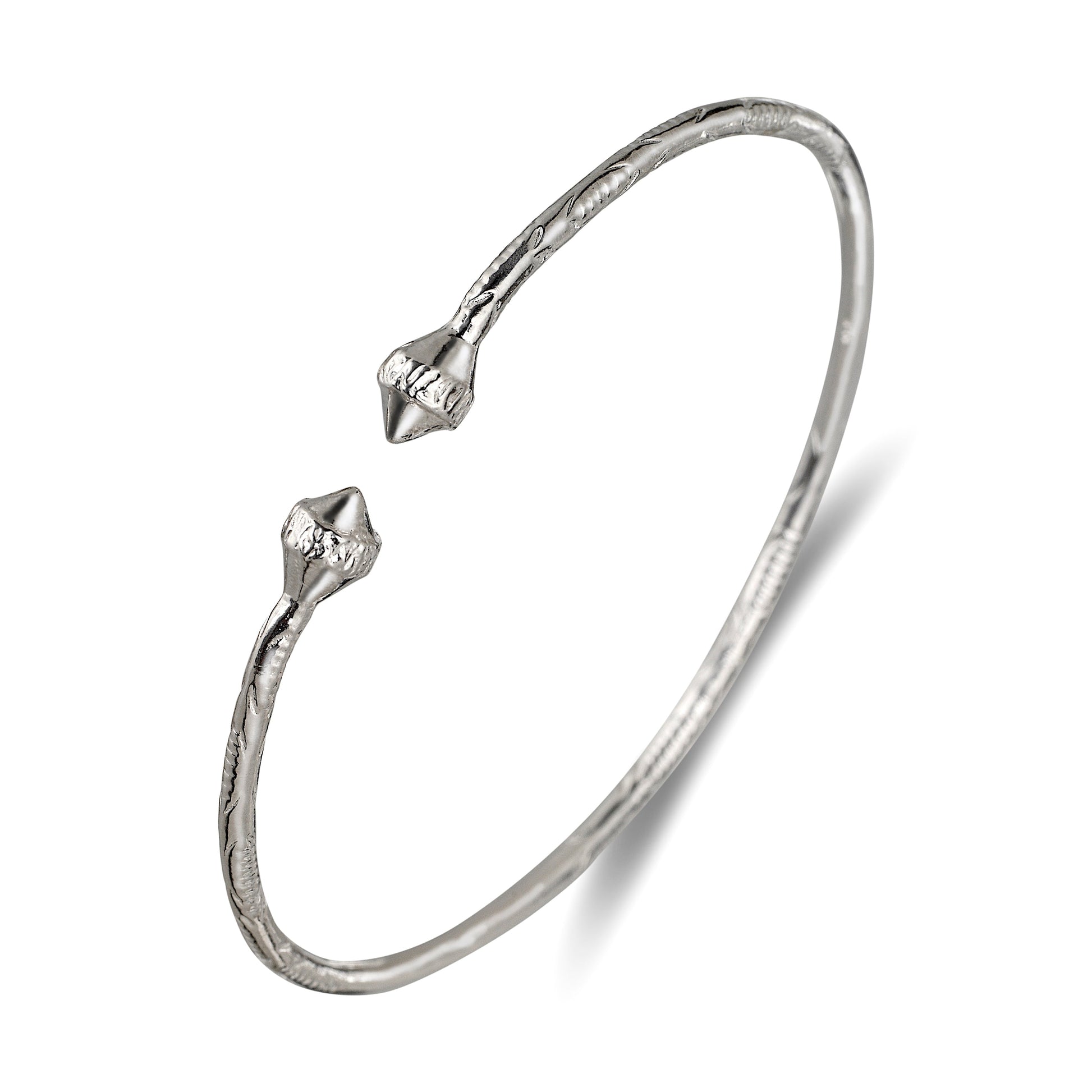 Stylish and sleek, these sterling silver West Indian bangles look great on the wrist, exuding confidence and freedom. Portions of the bangle are expertly carved and chiseled with intricate designs, bursting with mysterious tribal style, as the eye is drawn to the jagged lines and seductive curves. The ends are triangular and also carved, culminating in a sharp point, powerful and precise. These solid .925 sterling silver bangles are hand-crafted and semi-flexible, so they can be expanded to fit larger wrist sizes. Traditionally, these are worn in pairs.