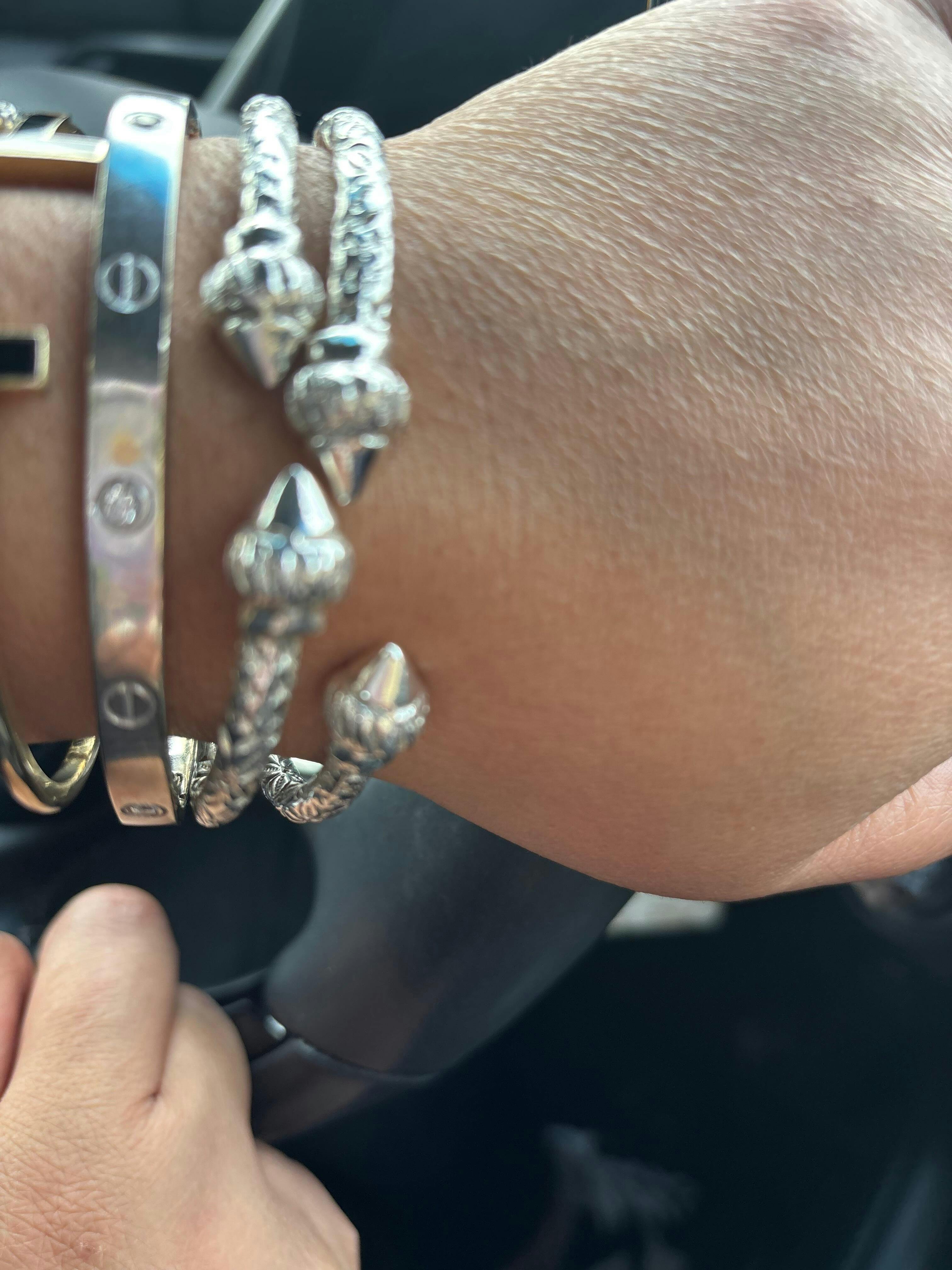 Stylish and sleek, sterling silver West Indian Bangles are immensely popular right now. The bangles are expertly carved and chiseled with intricate designs, bursting with mysterious tribal style, as the eye is drawn to the jagged lines and seductive curves. These bangles have pointy arrow-like tips with a circular frame on the edges