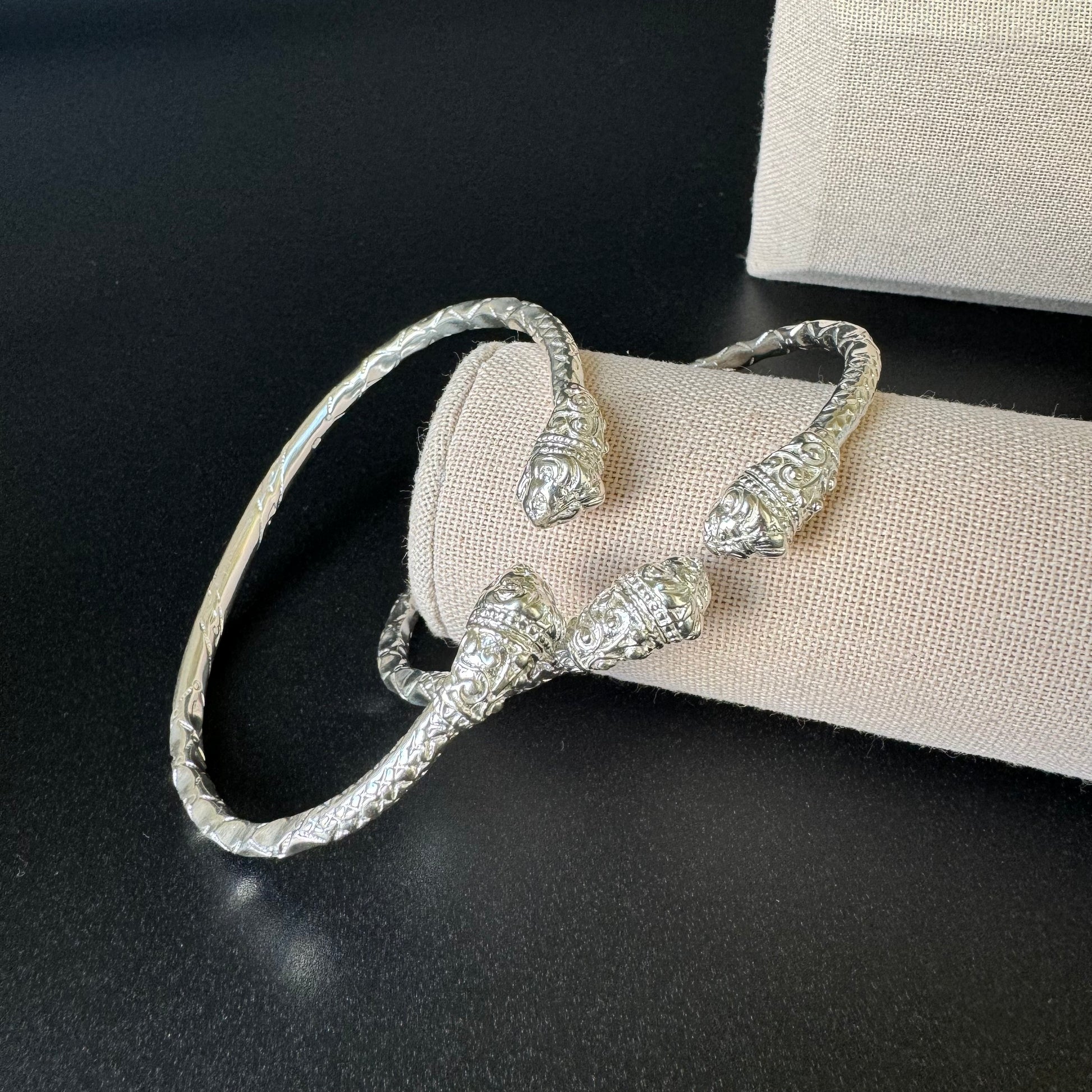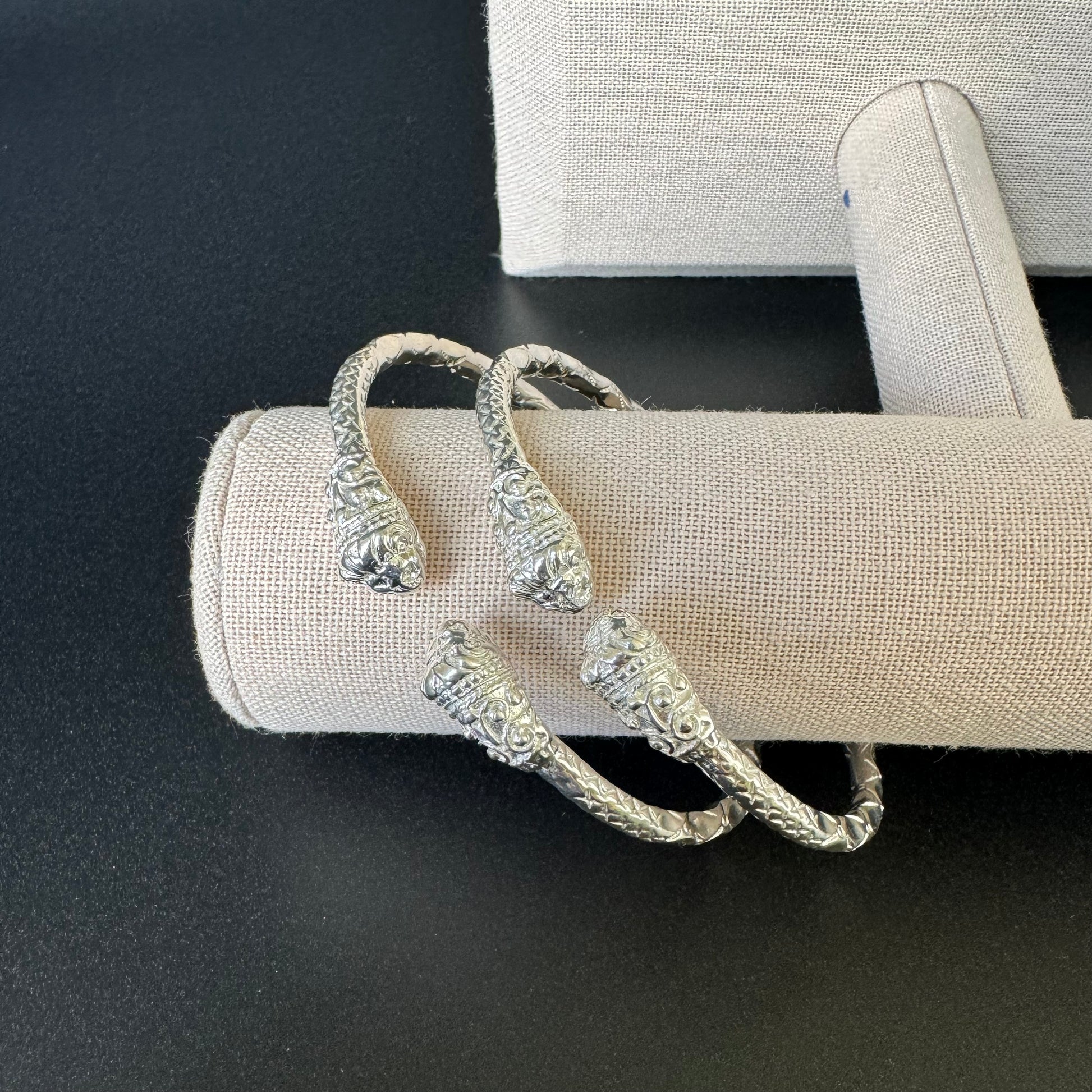 Stylish and sleek, sterling silver West Indian Bangles are immensely popular right now. These bangles feature gorgeous stone lion heads on the ends. The fierce expression, the fearless open mouth, and the hand-crafted etchings create a stunning new pair of bangles to add to your collection.