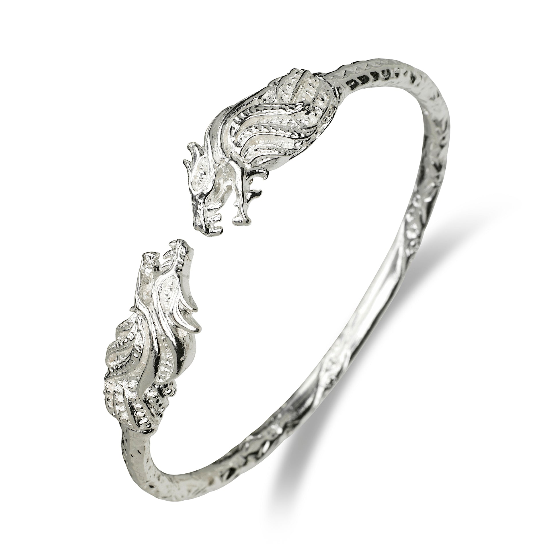 Powerful, sleek and angelical. This is a solid and heavy bangle. It features dragon ends.